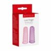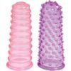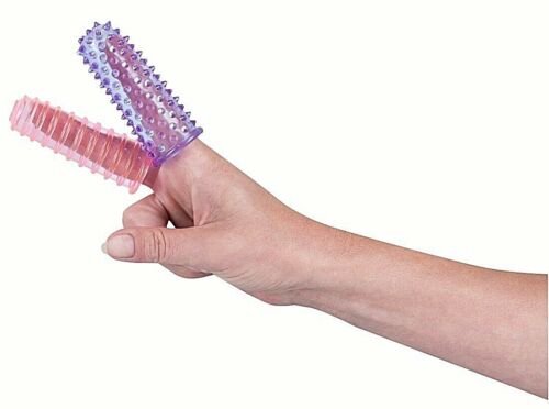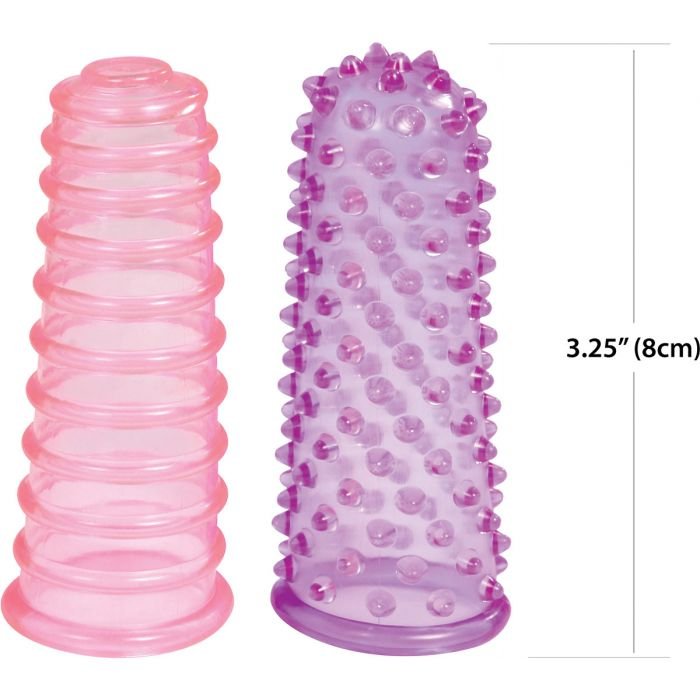 La manga de dedo rosa tiene un diseño acanalado y la manga morada tiene protuberancias. Estas mangas se pueden usar en cualquier dedo o en un vibrador, dando textura a ambos para una mayor diversión. Son fáciles de usar y también se pueden usar en la ducha. Estas fundas para los dedos están hechas de un material flexible, cómodo y no contienen ftalatos ni látex.