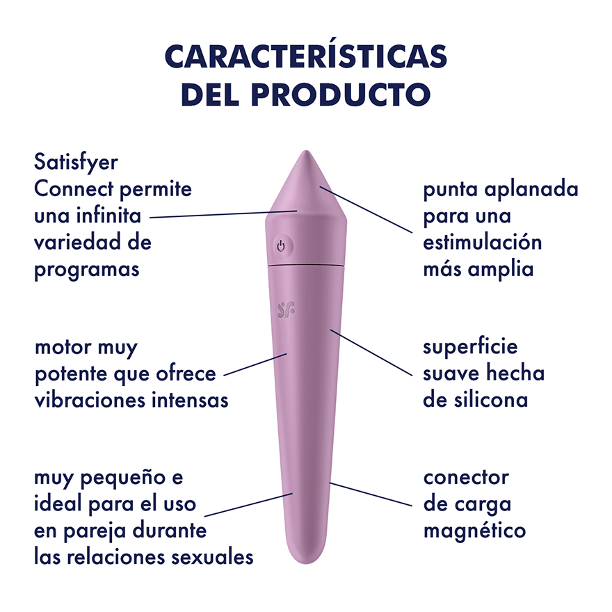 Con su extravagante aspecto, el Satisfyer Ultra Power Bullet 8 no solo destaca visualmente, sino que también aporta variedad a tus relaciones sexuales: utiliza su punta estrecha para una estimulación precisa del clÃtoris o deja que su superficie inclinada acaricie tus puntos más sensibles de forma más amplia. A pesar de su delgada estructura y su práctico tamaño, este mini vibrador, al igual que todos los Satisfyer Ultra Power Bullet, ofrece potentes e intensas vibraciones con 5 velocidades y 7 patrones de vibración, que también se pueden controlar a través de la aplicación Satisfyer Connect.